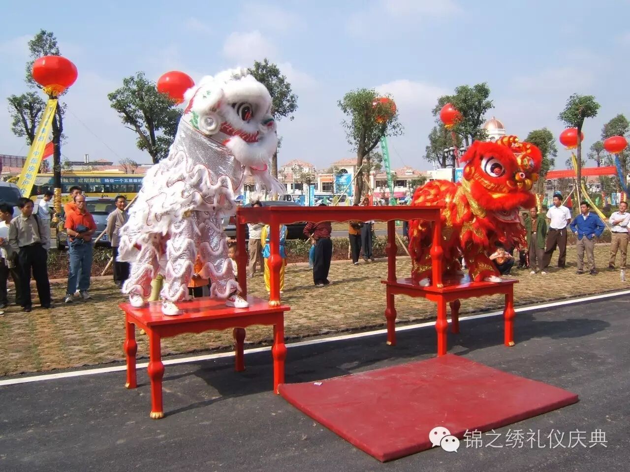 舞狮表演在庆典文化史上鹤立鸡群,屈手一指。逢年过节,人们总喜欢成群结队地去观看精彩的舞狮表演,让人大饱眼福,可谓“千狮齐集,欢腾闹新春。”在中国的传统文明中,狮子是祥瑞神兽,舞狮则是为驱赶邪恶而来。舞狮寓意事业步步高升,它们身披五彩斑斓,闪闪发亮的袍子,一双传神的大眼睛忽闪忽闪地,显得特别有神。它们踩着鼓点锣声生龙活虎地在柱子上跳跃起来,踏着欢快的脚步,时而做出的腾挪翻滚高难度动作,时而像个小孩似的向人们要东西吃。它们的动作是那么的协调,那么的娴熟,那么的栩栩如生。从远处看,就像是一只只彩蝶在欢快地翩翩起舞。